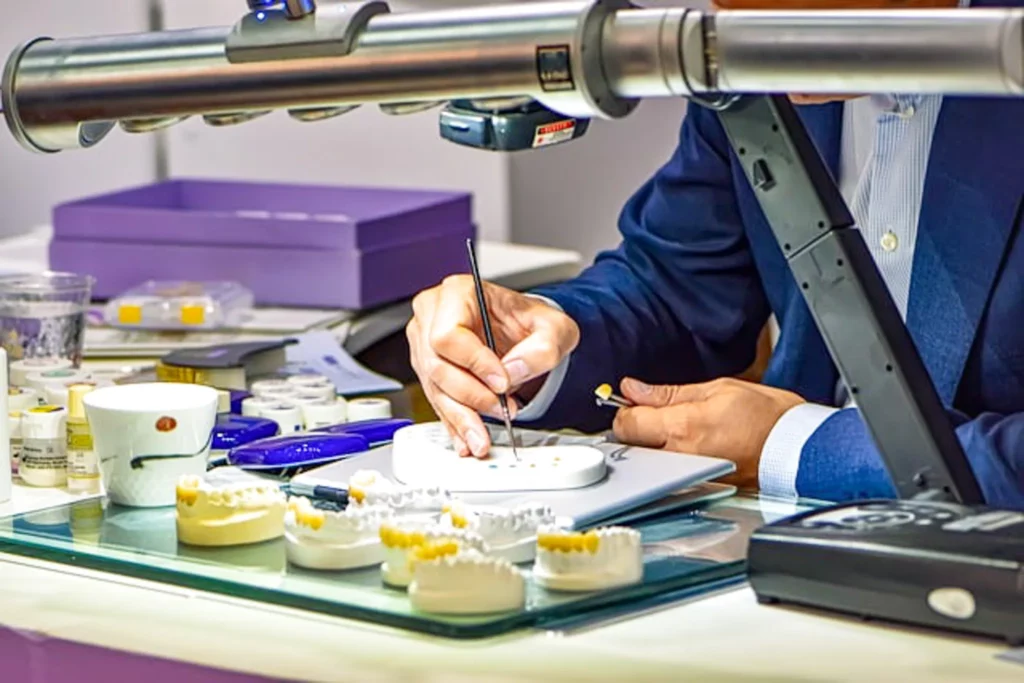 Kronen und Brücken werden aus unterschiedlichen Materialien wie Keramik oder Metalllegierungen gefertigt und dauerhaft auf den vorbereiteten Zähnen befestigt.